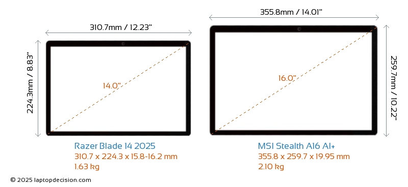 USBBoth Blade 14 2025 and Stealth A16 AI+ feature 2x USB 3.2 USB-A ports.Both Blade 14 2025 and Stealth A16 AI+ have USB Type-C ports. Blade 14 2025 has 2x USB 4.0 USB Type-C ports, while Stealth A16 AI+ has 1x USB 4.0 USB Type-C ports.