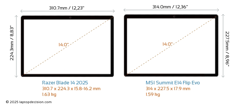Thunderbolt Summit E14 Flip Evo is equipped with Thunderbolt 4 port. Blade 14 2025 does not have Thunderbolt port.