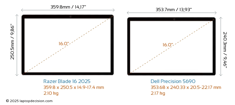 USB Blade 16 2025 is equipped with 3x USB 3.2 USB-A ports. Precision 5690 does not have USB-A ports.Both Blade 16 2025 and Precision 5690 have USB Type-C ports. Blade 16 2025 has 2x USB 4.0 USB Type-C ports, while Precision 5690 has 3x USB 4.0 USB Type-C ports.