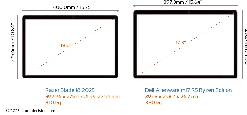 USBBoth Blade 18 2025 and Alienware m17 R5 Ryzen Edition feature 3x USB 3.2 USB-A ports.Both Blade 18 2025 and Alienware m17 R5 Ryzen Edition have USB Type-C ports. Blade 18 2025 has 2x USB 4.0 USB Type-C ports, while Alienware m17 R5 Ryzen Edition has 1x USB 4.0 USB Type-C ports.