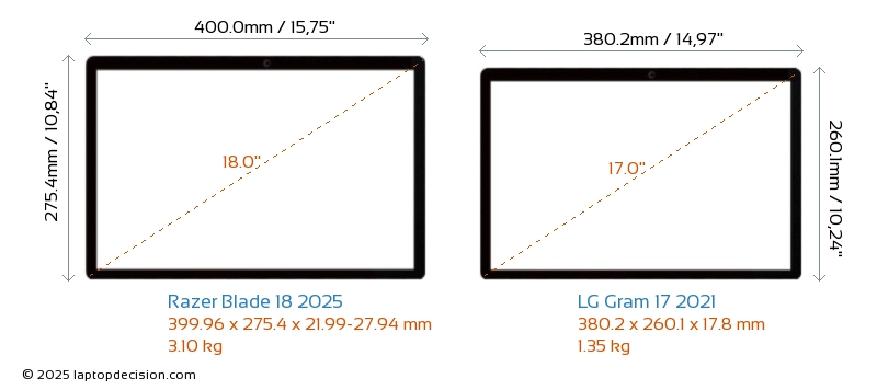 HDMIBoth Blade 18 2025 and Gram 17 2021 feature an HDMI port. Blade 18 2025 offers 1x HDMI 2.1, while Gram 17 2021 offers 1x HDMI 2.0.