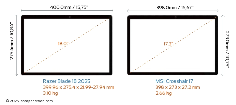 USBBoth Blade 18 2025 and Crosshair 17 feature 3x USB 3.2 USB-A ports.Both Blade 18 2025 and Crosshair 17 have USB Type-C ports. Blade 18 2025 has 2x USB 4.0 USB Type-C ports, while Crosshair 17 has 1x USB 3.2 USB Type-C ports.