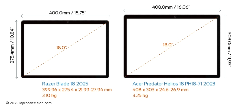 USBBoth Blade 18 2025 and Predator Helios 18 PH18-71 2023 feature 3x USB 3.2 USB-A ports.Both Blade 18 2025 and Predator Helios 18 PH18-71 2023 feature 2x USB 4.0 USB Type-C ports.