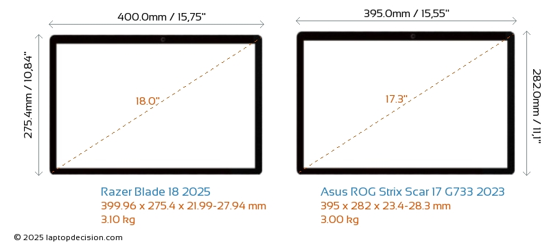 USBBoth Blade 18 2025 and ROG Strix Scar 17 G733 2023 have USB-A ports. Blade 18 2025 has 3x USB 3.2 USB-A ports, while ROG Strix Scar 17 G733 2023 has 2x USB 3.2 USB-A ports.Both Blade 18 2025 and ROG Strix Scar 17 G733 2023 have USB Type-C ports. Blade 18 2025 has 2x USB 4.0 USB Type-C ports, while ROG Strix Scar 17 G733 2023 has 2x USB 3.2 USB Type-C ports.