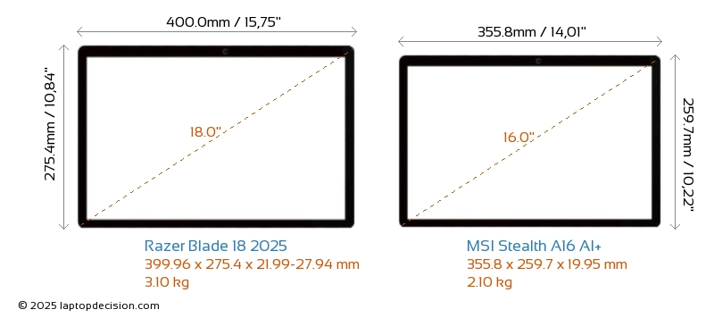 USBBoth Blade 18 2025 and Stealth A16 AI+ 2025 have USB-A ports. Blade 18 2025 has 3x USB 3.2 USB-A ports, while Stealth A16 AI+ 2025 has 2x USB 3.2 USB-A ports.Both Blade 18 2025 and Stealth A16 AI+ 2025 have USB Type-C ports. Blade 18 2025 has 2x USB 4.0 USB Type-C ports, while Stealth A16 AI+ 2025 has 1x USB 4.0 USB Type-C ports.