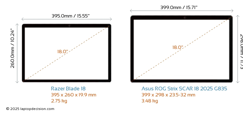 USBBoth Blade 18 and ROG Strix SCAR 18 2025 G835 feature 3x USB 3.2 USB-A ports.Both Blade 18 and ROG Strix SCAR 18 2025 G835 feature 2x USB 4.0 USB Type-C ports.