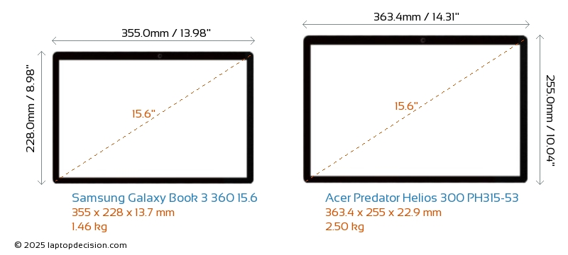 HDMIBoth Galaxy Book 3 360 15.6 and Predator Helios 300 PH315-53 feature an HDMI port. Galaxy Book 3 360 15.6 offers 1x HDMI 1.4, while Predator Helios 300 PH315-53 offers 1x HDMI 2.0.