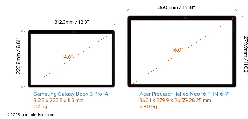 USBBoth Galaxy Book 3 Pro 14 and Predator Helios Neo 16 PHN16-71 have USB-A ports. Galaxy Book 3 Pro 14 has 1x USB 3.2 USB-A ports, while Predator Helios Neo 16 PHN16-71 has 3x USB 3.2 USB-A ports.Both Galaxy Book 3 Pro 14 and Predator Helios Neo 16 PHN16-71 have USB Type-C ports. Galaxy Book 3 Pro 14 has 2x USB 4.0 USB Type-C ports, while Predator Helios Neo 16 PHN16-71 has 2x USB 3.2 USB Type-C ports.