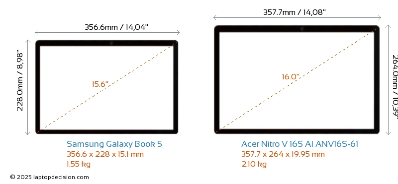 HDMIBoth Galaxy Book 5 and Nitro V 16S AI ANV16S-61 feature an HDMI port. Galaxy Book 5 offers 1x HDMI 1.4, while Nitro V 16S AI ANV16S-61 offers 1x HDMI 2.1.