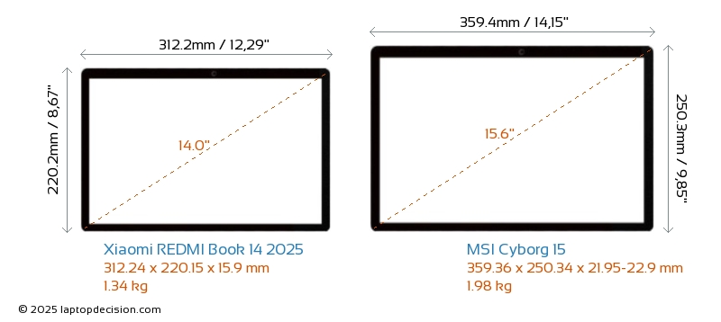 USBBoth REDMI Book 14 2025 and Cyborg 15 feature 2x USB 3.2 USB-A ports.Both REDMI Book 14 2025 and Cyborg 15 have USB Type-C ports. REDMI Book 14 2025 has 2x USB 4.0 USB Type-C ports, while Cyborg 15 has 1x USB 3.2 USB Type-C ports.