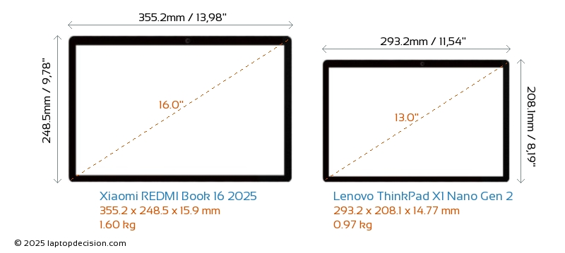 HDMI REDMI Book 16 2025 features an HDMI port (1x HDMI 2.1) for connecting to external monitors. ThinkPad X1 Nano Gen 2 does not have an HDMI port.
