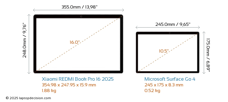 HDMI REDMI Book Pro 16 2025 features an HDMI port (1x HDMI 2.1) for connecting to external monitors. Surface Go 4 does not have an HDMI port.