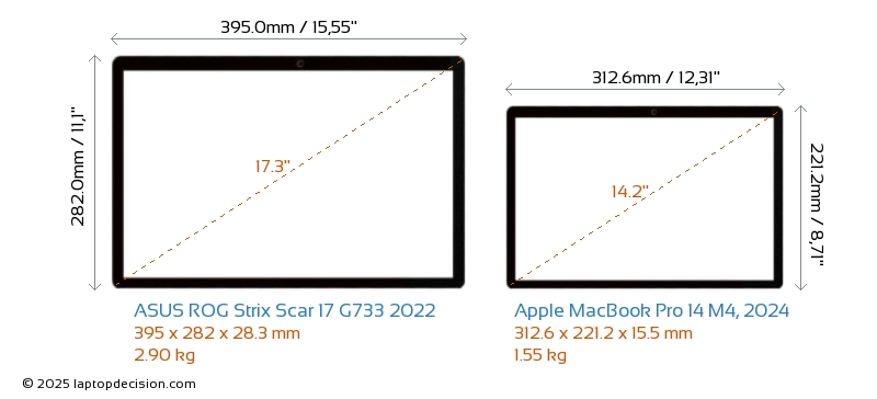HDMIBeide, ROG Strix Scar 17 G733 2022 und MacBook Pro 14 M4, 2024, verfügen über einen HDMI-Port (1x HDMI 2.1) zum Anschluss an externe Monitore.