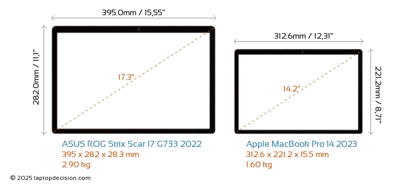 HDMIBeide, ROG Strix Scar 17 G733 2022 und MacBook Pro 14 2023, verfügen über einen HDMI-Port (1x HDMI 2.1) zum Anschluss an externe Monitore.