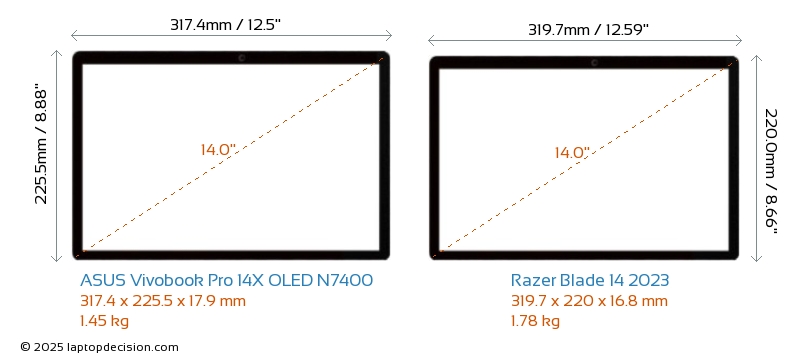 ThunderboltVivobook Pro 14X OLED N7400 ist mit einem Thunderbolt 4-Port ausgestattet. Blade 14 2023 hat keinen Thunderbolt-Port.