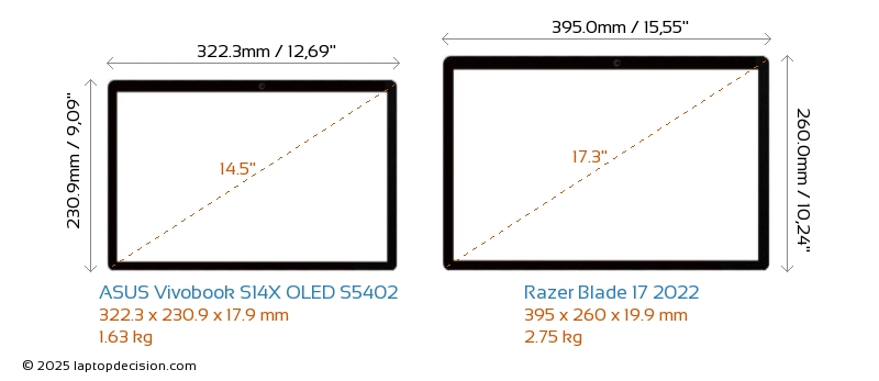 HDMIVivobook S14X OLED S5402 verfügt über einen HDMI-Port (1x HDMI 2.0) zum Anschluss an externe Monitore. Blade 17 2022 hat keinen HDMI-Port.