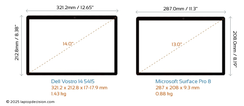 HDMIVostro 14 5415 verfügt über einen HDMI-Port (1x HDMI 1.4) zum Anschluss an externe Monitore. Surface Pro 8 hat keinen HDMI-Port.