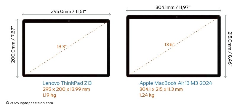 HDMINeither ThinkPad Z13 nor MacBook Air 13 M3 2024 has an HDMI port for connecting to external monitors. Weder ThinkPad Z13 noch MacBook Air 13 M3 2024 haben einen HDMI-Port für den Anschluss an externe Monitore.