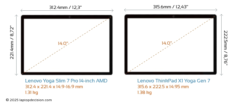 HDMIThinkPad X1 Yoga Gen 7 verfügt über einen HDMI-Port (1x HDMI 2.0) zum Anschluss an externe Monitore. Yoga Slim 7 Pro 14-inch AMD hat keinen HDMI-Port.
