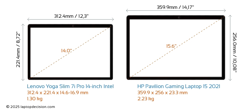 HDMI Pavilion Gaming Laptop 15 2021 verfügt über einen HDMI-Port (1x HDMI 2.0) zum Anschluss an externe Monitore. Yoga Slim 7i Pro 14-inch Intel hat keinen HDMI-Port.