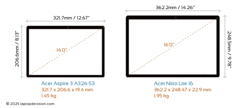 HDMIBeide, Aspire 3 A324-53 und Nitro Lite 16, verfügen über einen HDMI-Port. Aspire 3 A324-53 bietet 1x HDMI 1.4, während Nitro Lite 16 1x HDMI 2.1 bietet.