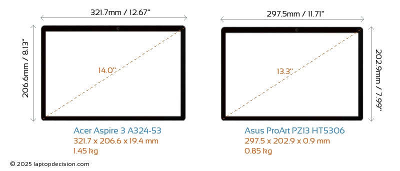 HDMI Aspire 3 A324-53 verfügt über einen HDMI-Port (1x HDMI 1.4) zum Anschluss an externe Monitore. ProArt PZ13 HT5306 hat keinen HDMI-Port.