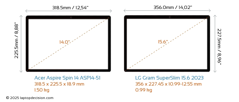 HDMI Aspire Spin 14 ASP14-51 verfügt über einen HDMI-Port (1x HDMI 2.1) zum Anschluss an externe Monitore. Gram SuperSlim 15.6 2023 hat keinen HDMI-Port.