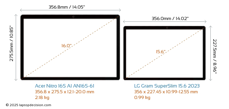 HDMI Nitro 16S AI AN16S-61 verfügt über einen HDMI-Port (1x HDMI 2.1) zum Anschluss an externe Monitore. Gram SuperSlim 15.6 2023 hat keinen HDMI-Port.