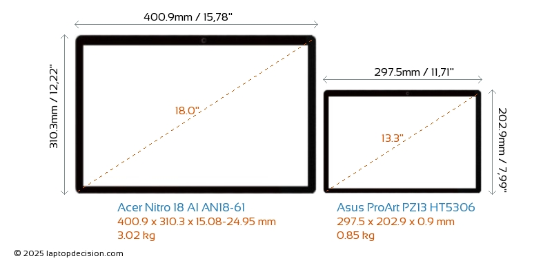 HDMI Nitro 18 AI AN18-61 verfügt über einen HDMI-Port (1x HDMI 2.1) zum Anschluss an externe Monitore. ProArt PZ13 HT5306 hat keinen HDMI-Port.
