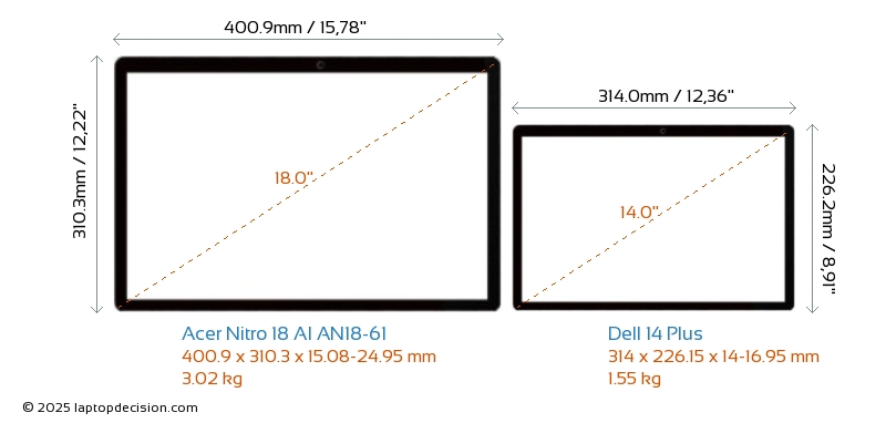 USBBeide Nitro 18 AI AN18-61 und 14 Plus haben USB-A-Ports. Nitro 18 AI AN18-61 hat 3x USB 3.2 USB-A-Ports, während 14 Plus 1x USB 3.2 USB-A-Ports hat.Beide Nitro 18 AI AN18-61 und 14 Plus verfügen über 2x USB 4.0 USB-Type-C-Ports.