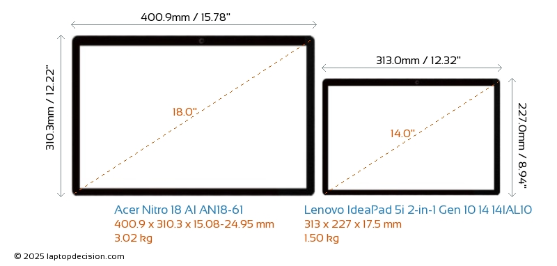 HDMIBeide, Nitro 18 AI AN18-61 und IdeaPad 5i 2-in-1 Gen 10 14 14IAL10, verfügen über einen HDMI-Port. Nitro 18 AI AN18-61 bietet 1x HDMI 2.1, während IdeaPad 5i 2-in-1 Gen 10 14 14IAL10 1x HDMI 1.4 bietet.