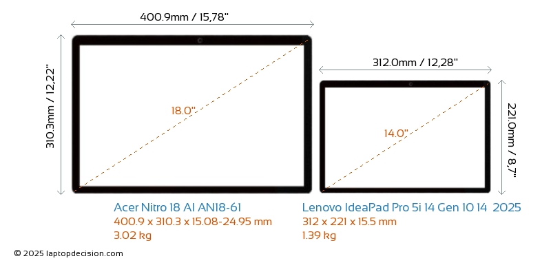 HDMIBeide, Nitro 18 AI AN18-61 und IdeaPad Pro 5i 14 Gen 10 14 2025, verfügen über einen HDMI-Port (1x HDMI 2.1) zum Anschluss an externe Monitore.