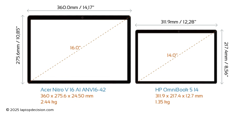 HDMI Nitro V 16 AI ANV16-42 verfügt über einen HDMI-Port (1x HDMI 2.1) zum Anschluss an externe Monitore. OmniBook 5 14 hat keinen HDMI-Port.