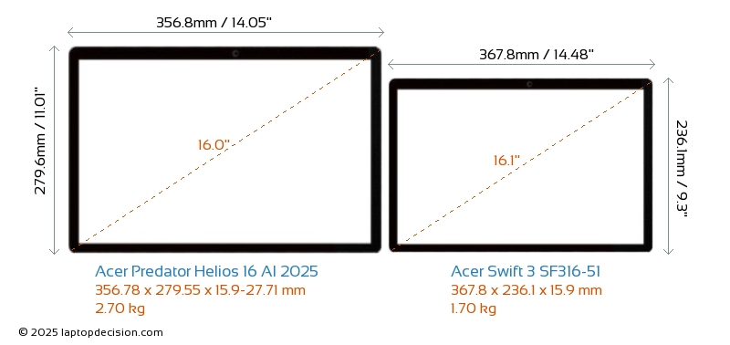 HDMIBeide, Predator Helios 16 AI 2025 und Swift 3 SF316-51, verfügen über einen HDMI-Port. Predator Helios 16 AI 2025 bietet 1x HDMI 2.1, während Swift 3 SF316-51 1x HDMI 2.0 bietet.
