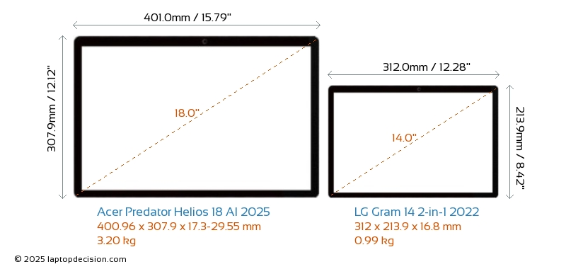 ThunderboltBeide, Predator Helios 18 AI 2025 und Gram 14 2-in-1 2022, verfügen über Thunderbolt-Ports. Predator Helios 18 AI 2025 hat Thunderbolt 5, während Gram 14 2-in-1 2022 Thunderbolt 4 hat.