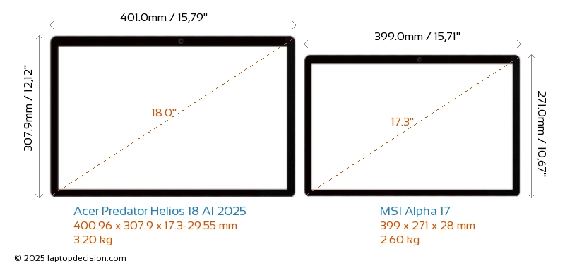 HDMIBeide, Predator Helios 18 AI 2025 und Alpha 17, verfügen über einen HDMI-Port. Predator Helios 18 AI 2025 bietet 1x HDMI 2.1, während Alpha 17 1x HDMI 2.0 bietet.