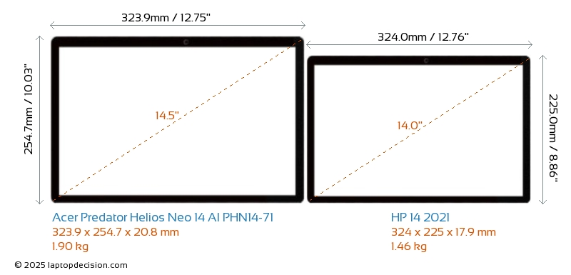 HDMIBeide, Predator Helios Neo 14 AI PHN14-71 und 14 2021, verfügen über einen HDMI-Port. Predator Helios Neo 14 AI PHN14-71 bietet 1x HDMI 2.1, während 14 2021 1x HDMI 1.4 bietet.