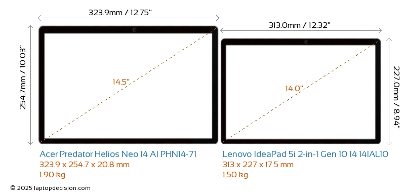 Thunderbolt Predator Helios Neo 14 AI PHN14-71 ist mit einem Thunderbolt 4-Port ausgestattet. IdeaPad 5i 2-in-1 Gen 10 14 14IAL10 hat keinen Thunderbolt-Port.