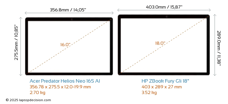 HDMI ZBook Fury G1i 18" verfügt über einen HDMI-Port (1x HDMI 2.1) zum Anschluss an externe Monitore. Predator Helios Neo 16S AI hat keinen HDMI-Port.
