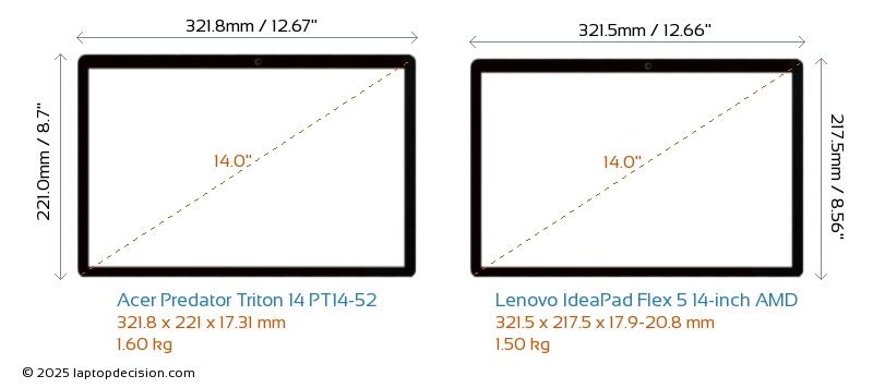 HDMIBeide, Predator Triton 14 PT14-52 und IdeaPad Flex 5 14-inch AMD, verfügen über einen HDMI-Port. Predator Triton 14 PT14-52 bietet 1x HDMI 2.1, während IdeaPad Flex 5 14-inch AMD 1x HDMI 1.4 bietet.