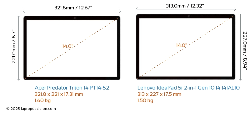 HDMIBeide, Predator Triton 14 PT14-52 und IdeaPad 5i 2-in-1 Gen 10 14 14IAL10, verfügen über einen HDMI-Port. Predator Triton 14 PT14-52 bietet 1x HDMI 2.1, während IdeaPad 5i 2-in-1 Gen 10 14 14IAL10 1x HDMI 1.4 bietet.