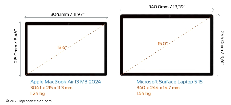 HDMINeither MacBook Air 13 M3 2024 nor Surface Laptop 5 15 has an HDMI port for connecting to external monitors. Weder MacBook Air 13 M3 2024 noch Surface Laptop 5 15 haben einen HDMI-Port für den Anschluss an externe Monitore.