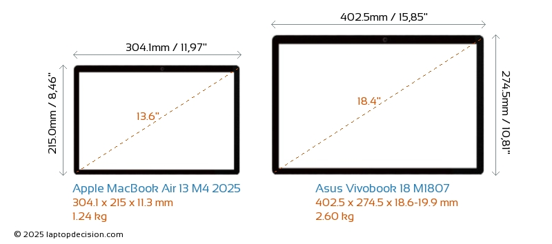 HDMI Vivobook 18 M1807 verfügt über einen HDMI-Port (1x HDMI 2.1) zum Anschluss an externe Monitore. MacBook Air 13 M4 2025 hat keinen HDMI-Port.