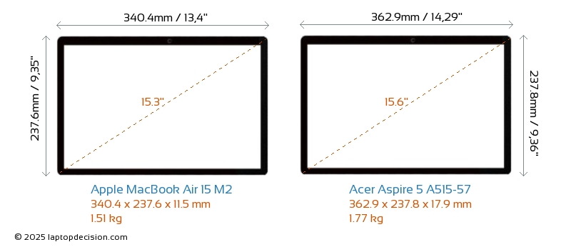 HDMIAspire 5 A515-57 verfügt über einen HDMI-Port (1x HDMI 2.1) zum Anschluss an externe Monitore. MacBook Air 15 M2 hat keinen HDMI-Port.