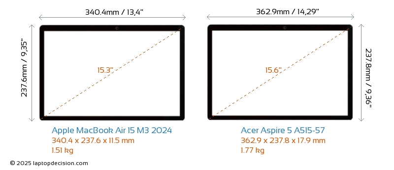 HDMIAspire 5 A515-57 verfügt über einen HDMI-Port (1x HDMI 2.1) zum Anschluss an externe Monitore. MacBook Air 15 M3 2024 hat keinen HDMI-Port.