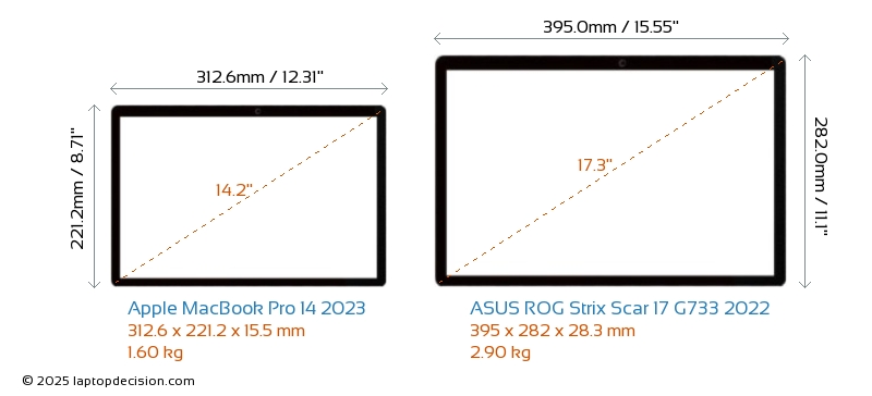 SD-Kartenleser MacBook Pro 14 2023 ist mit einem SD-Kartenleser ausgestattet, um einen einfachen Zugriff auf Speicherkarten zu ermöglichen. ROG Strix Scar 17 G733 2022 hat keinen SD-Kartenleser.