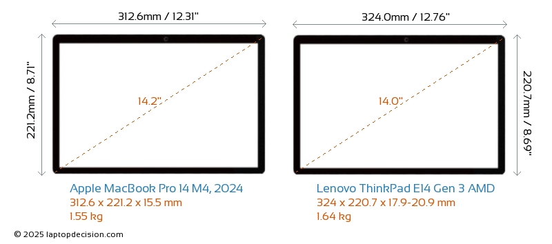 Thunderbolt MacBook Pro 14 M4, 2024 ist mit einem Thunderbolt 4-Port ausgestattet. ThinkPad E14 Gen 3 AMD hat keinen Thunderbolt-Port.