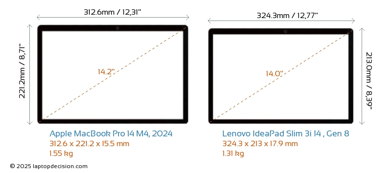 Thunderbolt MacBook Pro 14 M4, 2024 ist mit einem Thunderbolt 4-Port ausgestattet. IdeaPad Slim 3i 14 , Gen 8 hat keinen Thunderbolt-Port.