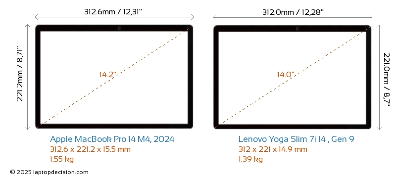 AudioanschlussBeide, MacBook Pro 14 M4, 2024 und Yoga Slim 7i 14 , Gen 9, sind mit einem 3,5-mm-Audioanschluss ausgestattet, der eine nahtlose Verbindung zu Kopfhörern und Lautsprechern ermöglicht.