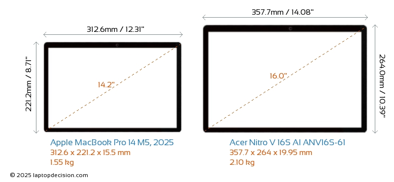 HDMIBeide, MacBook Pro 14 M5, 2025 und Nitro V 16S AI ANV16S-61, verfügen über einen HDMI-Port (1x HDMI 2.1) zum Anschluss an externe Monitore.